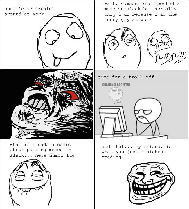 Then, it’s onto my new gig as a “management consultant” for Academi (formerly Blackwater). I love remote working because I get to be so funny with my Zoom background. Like sometimes I make it the beach and stuff, and one time I made it the conference room from The Office and my boss (Erik Prince) freaked out because he thought it was so funny. His favorite character is Creed because he’s so random, and he likes to scuba. Sometimes on the work Slack I send memes like this: