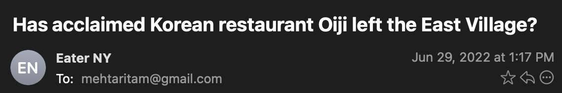 Idk… why don’t you go there and fucking find out yourself instead of emailing me, yknow? Pound some fuckin pavement, you goddamn jamokes. Let me guess: your Eater reporter is going up to some random construction worker on Avenue A and being like "hey, you seen acclaimed Korean restaurant Oiji around?" And the worker is like "Who's askin" and Eater reporter is like "the readers of eater" and the construction worker is like "da eaters of reader??" And at this point the reporter is so upset that they've had to spend so long talking to someone with working class bona fides that they start to cry... and the construction worker is like "it's okay man, here's a hanky" and the hanky has "Oiji" embroidered in the corner and the reporter is like "where did you get this" and the worker is like "I don't know nothing I swear it weren't me" and the reporter is threatening him at this point and the worker is cowering under the man's fist and the reporter is like "okay I believe you" and sends this email asking ME instead?? Are you fucking joking???? Do your job!!!