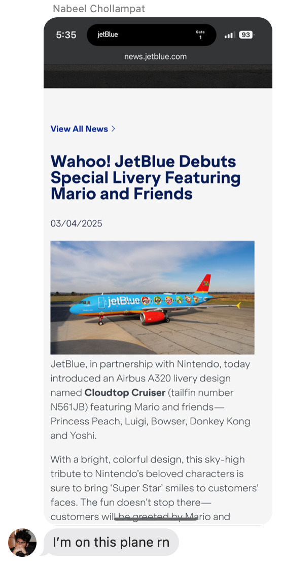 Nah. But fr? (Serious Substack Guy voice) We need to talk about what this Nintendo x JetBlue collab means for the future of Brand. This type of activation is pretty unprecedented and is what all brands need to be looking to as an example of unexpected points of leverage. Here’s my guiding principle: