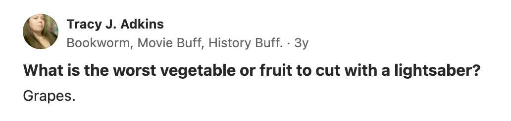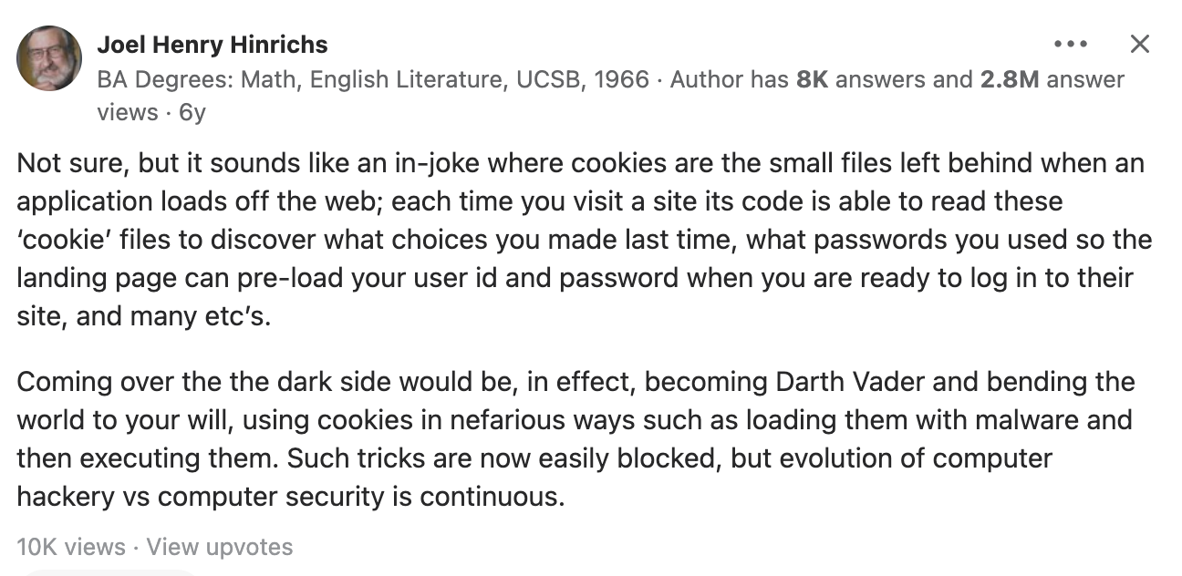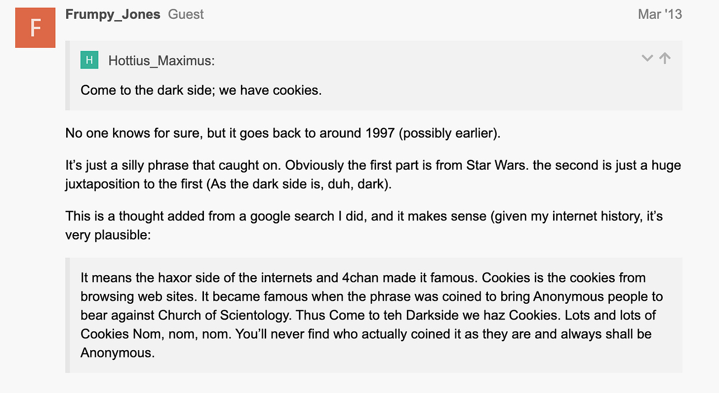 So you know what, Tracy? I’ll let you have this one. You invented the phrase “Come to the Dark Side. We have cookies.” Whoever invented it, this guy is definitely wrong:
