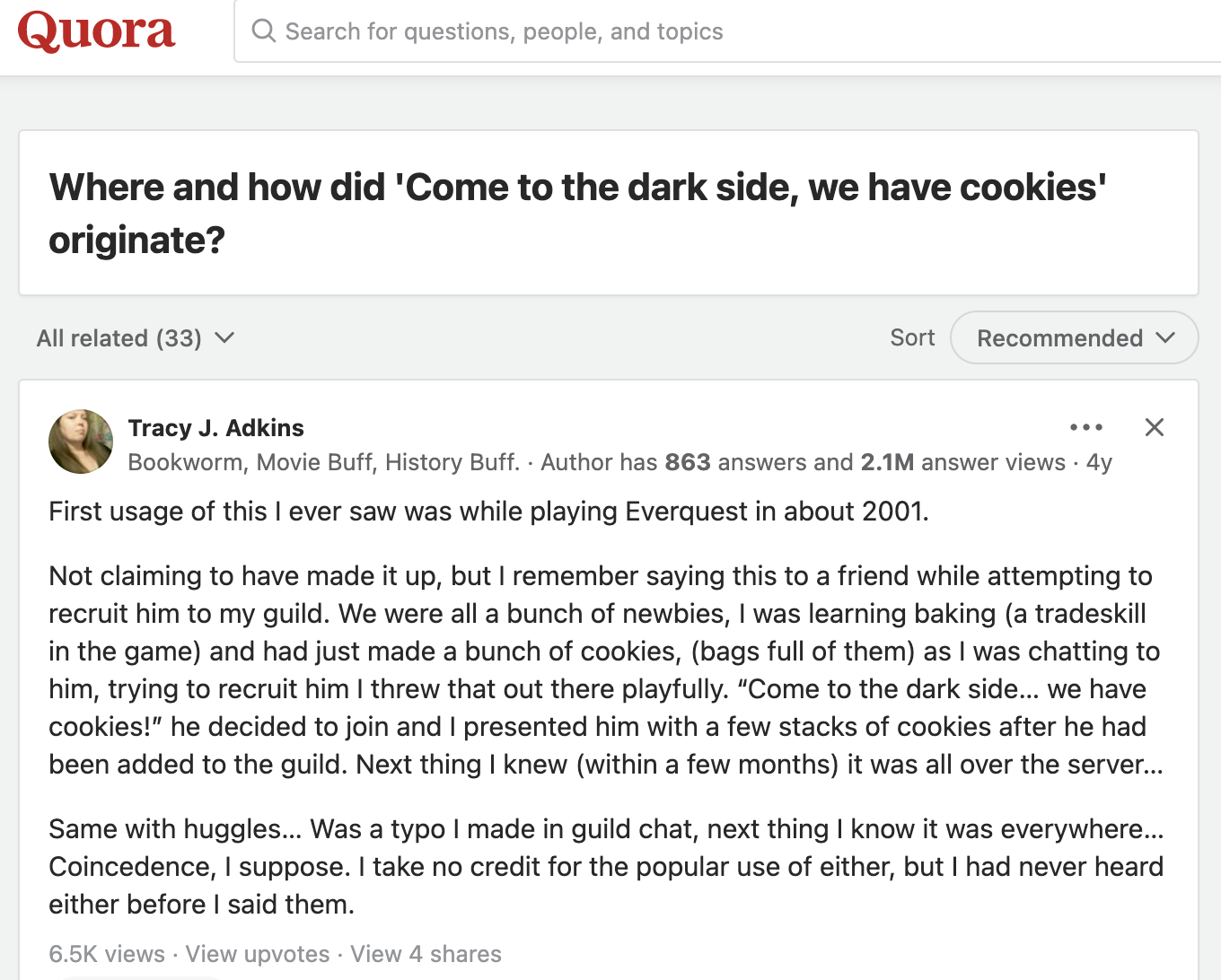 Ah, well, there’s that done and dusted. Thank god the actual inventor of the phrase came out of the woodwork to explain that the origin of the thing. I guess it’s from one session of Everquest in 2001, where this lady Tracy was learning a valuable tradeskill and presented a recruit with a bunch of cookies. She came up with the phrase, it spread around the server, and bing bam boom, there’s that then.