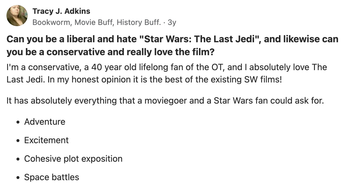 The more I continued to poke around the Quora history, the more complete a picture of Tracy’s life I started to form. Her husband cheated on her and left; she lives with her son off of food stamps and child support. Trump’s Child Tax Credit was a huge boon to her life and gave her a lot of relief. I began feeling uncomfortable about knowing this much. My mind swirled. Life is hard, life is always hard. We cling to the stories that make us feel big and tell them to ourselves over and over to constantly reaffirm our worth and importance. I sat in the background of an episode of the Chris Gethard show one time and sometimes I go look at it because it’s a kind of acknowledgment in the wider world that I exist.