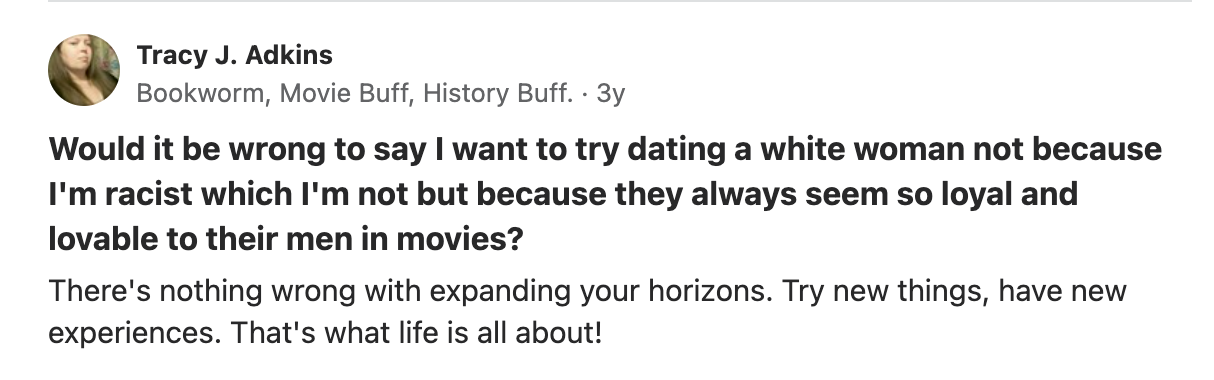 Frumpy Jones on the Straight Dope forums posits that the phrase was around in 1997. At this point, my mind was awhirl. Was Tracy a liar? I decided to dig around in her Quora history to see if she had a pattern of fabrication