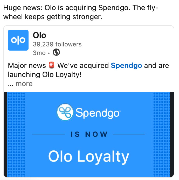 I’ll be honest: one of my oldest friends posted this. It was around the time that Olo acquired Spendgo, I think? But he was right—it was huge news. Olo acquired Spendgo. Let that sink in.