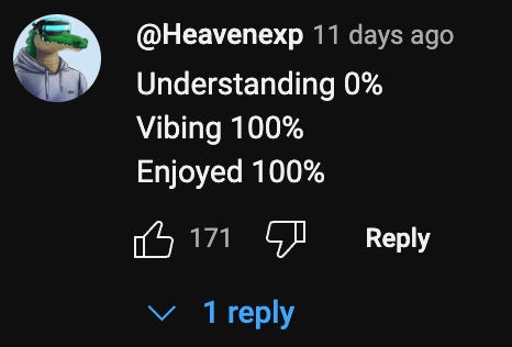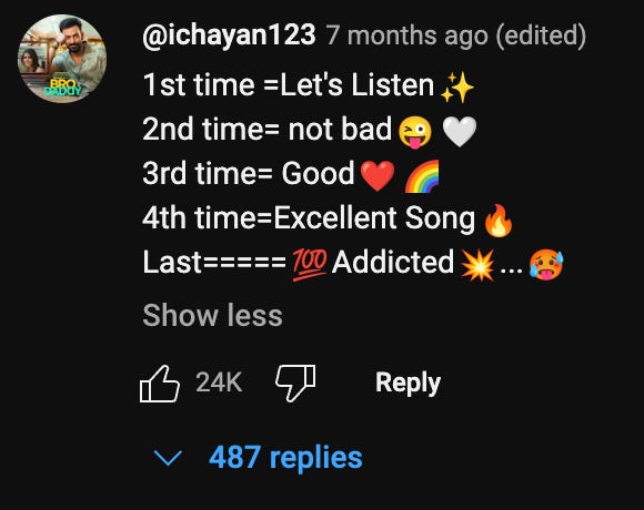 Staggering implications in that first youtube comment. He concludes he is addicted, and yet it’s labelled as his ‘last’ listen. Does he possess superhuman strength of will to overcome addiction immediately upon recognition of said addiction? We truly live in the age of GLP-1 agonists…