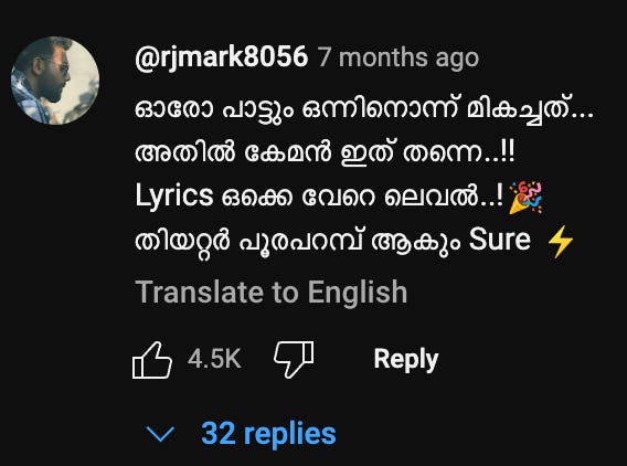 Scrolling through comments on YouTube video as the car weaves through rancid Bangalore traffic. I feel similarly to these people lowkey.