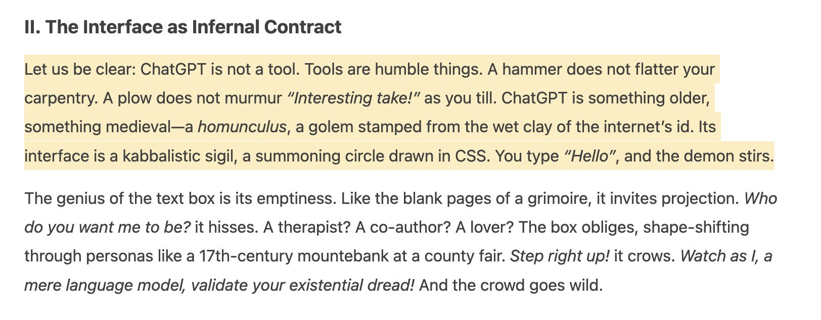 What you guys don’t realize is that writing is fucking intangible, brother. It’s, it’s…it’s indefinable. It’s not easy at all. It’s actually one of the most physically painful and laborious things you can do, and anyone who does it should be treated like God. You don’t even understand how hard it is, and how much more important than other people you become once you start typing on a keyboard. And trust me, I know. I’m literally studying it. I’m actually becoming so smart and employable from being a graduate student in fiction. Trust me on this. Good writing isn’t a prompt you enter into a little Chinese open-source box and hope it spits out a fire 🔥🔥🔥 poem. It’s something, well…a little more like this.