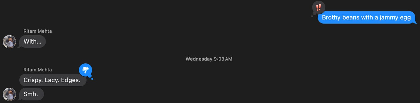 I—using my vigorous American mind, unstupided—easily decipher most of it: bro had Brothy Beans with a Jammy Egg. The final piece of the puzzle, however, eluded us.