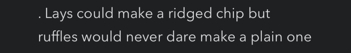 There could be a few explanations for this dichotomy. Maybe it’s simply that Lay’s has complete market share, and by sheer force of will, has the financial and cultural capital to experiment with whatever flavors and textures and formats it cares to, while poor little Ruffles, a bit player in the world of crunchy snacks, doesn’t have the latitude to experiment willy-nilly. This is bullying, plain and simple.