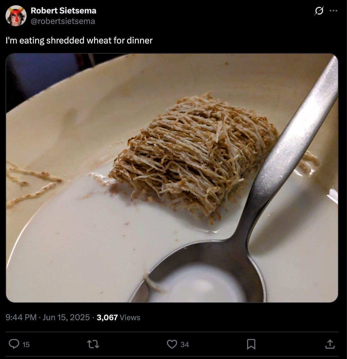 I’m loving the vulnerability, yes. Soft masculinity, for sure. But also—the little bits of shredded wheat, moistened and made soft by milk, clinging to the side of the bowl and the spoon—yucky!!!!! Yuck!